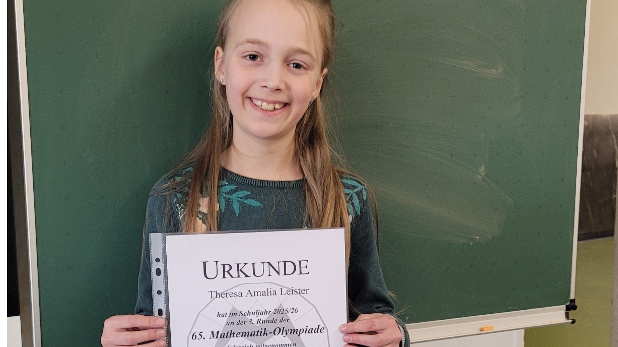 Theresa Leister (5a) erzielte am 22. Februar 2026 einen beachtlichen 2. Platz in der 3. Runde der 65. Mathematik-Olympiade. In der 3. Runde, auch Landesrunde genannt, traten die besten Schülerinnen und Schüler aus verschiedenen Städten der Region Chemnitz gegeneinander an.