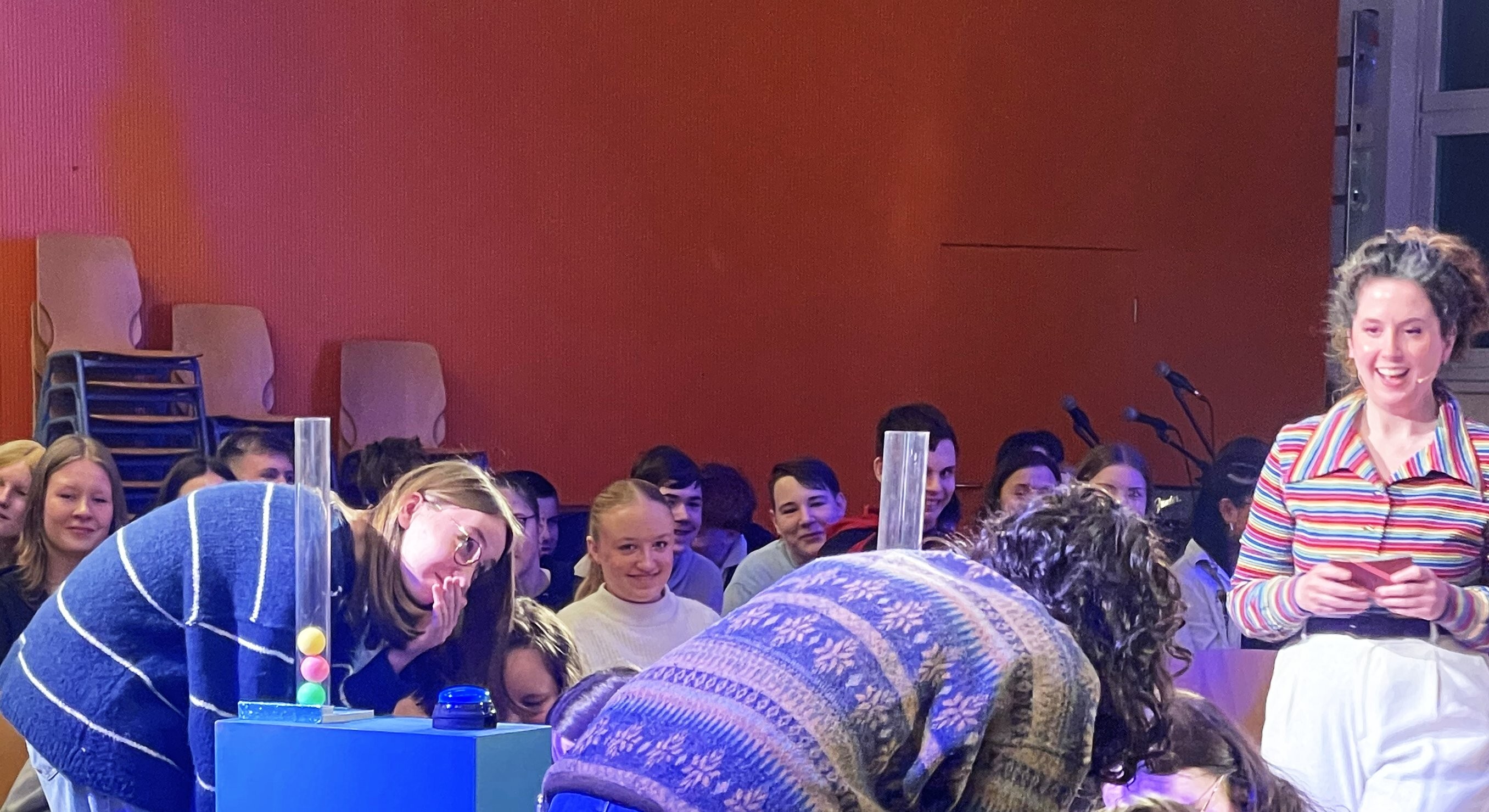 Unter dem Titel „All Gender*splaining“ wurde der Jahrgang über das Thema geschlechtliche Vielfalt aufgeklärt. Das Theaterstück wurde in Form einer Gameshow aufgeführt. Nachdem die beiden Schauspieler zwei Teams ermittelt hatten, indem sie die Neuntklässler durch „entweder oder Fragen“ mischten, waren alle spielbereit.
